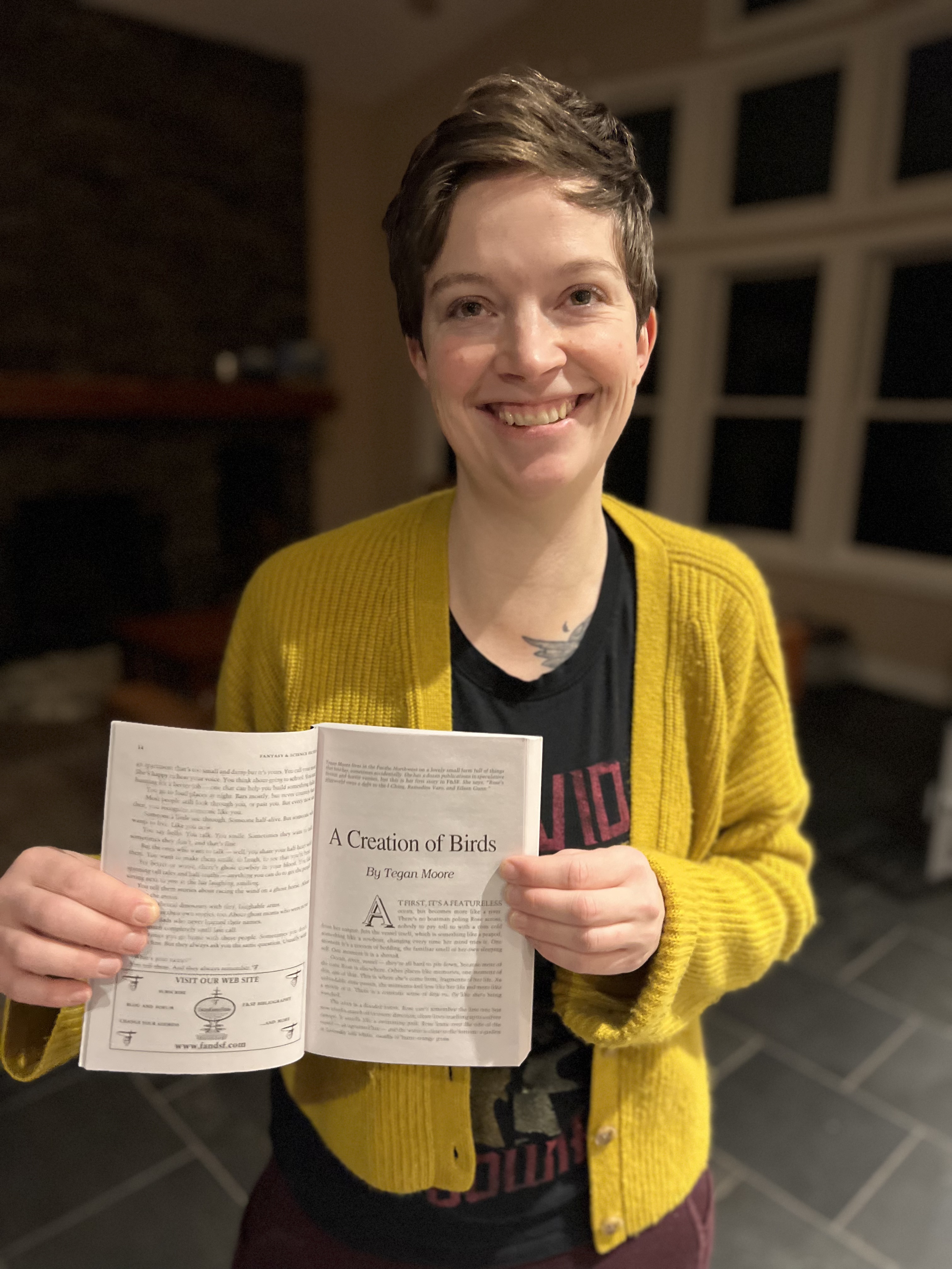 A Creation of Birds On January 6, 2023January 6, 2023 By alarmhat Here’s me in my pajamas with my newest story, out this month in F&SF. It’s a weird one! YOU ARE WELCOME. You can find “A Creation of Birds” in the Jan/Feb 2023 issue of the Magazine of Fantasy & Science Fiction. Share this: Click to share on X (Opens in new window) X Click to share on Facebook (Opens in new window) Facebook Like Loading... Related